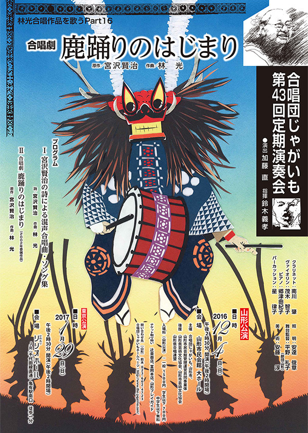 1945年に出会い、1977年にはじめてその詩に曲をつけ、1986年にはじめてオペラを書いた宮沢賢治サンとのつきあい。1977年の『鼠たちの伝説』(佐藤信)からはじまった、呼び名はいろいろ変わるが〈合唱劇〉の経験。1970年にジャズシンガー安田南が歌った『センチメンタルジャーニー』いらいの加藤直との共同作業。そして1986年いらいの「じゃがいも」との日々。それらすべての流れがひとつに合流して、きょうの『鹿踊りのはじまり』はあるのだと思っている。