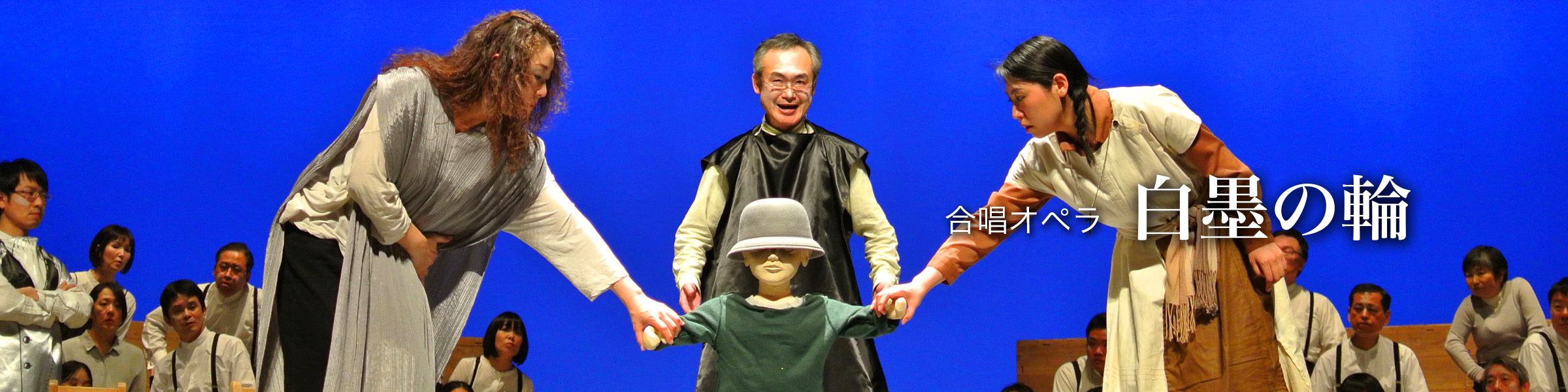 私の『白墨の輪』は、そういう意味でなら、まさに、《難しい理屈はいらない》オペラです。物語の中心になっているのは、大岡裁きの話にもある、ほんとうの母親を発見するために、子供をひっぱりっこする、あれです。登場人物はみんな、どこにでもいそうな、子供が可愛かったり、子供が邪魔だったり、あるいはその両方だったり、でなければお金が欲しかったり……。音楽のすばらしいちからの助けをかりて、そんな人々の生きかたを二時間半の歌芝居にまとめたものです。