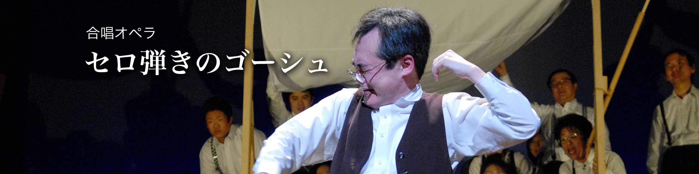 前回(2006年)上演した、音楽劇「革トランク・賢治の東京」にオペラ「セロ弾きのゴーシュ」の一場面を組み込んだ。賢治が在京中にオーケストラの練習を見学したというハナシから思いついて、オペラをそのまま群唱してみたのを「じゃがいも」が気に入り、加藤直さんにも賛同してもらって、今回の全曲上演となった。