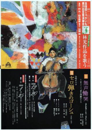 林光作品の中でも、「セロ弾きのゴーシュ」は、特別な作品である。林氏の宮沢賢治に対する思いが熟成され、老若男女誰にでも楽しめ、初演したオペラシアターこんにゃく座においても、何度も再演され、今でも代表的演目として人気を博している。この林氏の代表作に合唱団じゃがいもが挑戦することになった。それは、2年前の「賢治の東京」の中で、「セロ弾きのゴーシュ」の第一場を上演したのが好評だったことから、アマチュアでも全場やれるのでは、ということになり決まったもの。