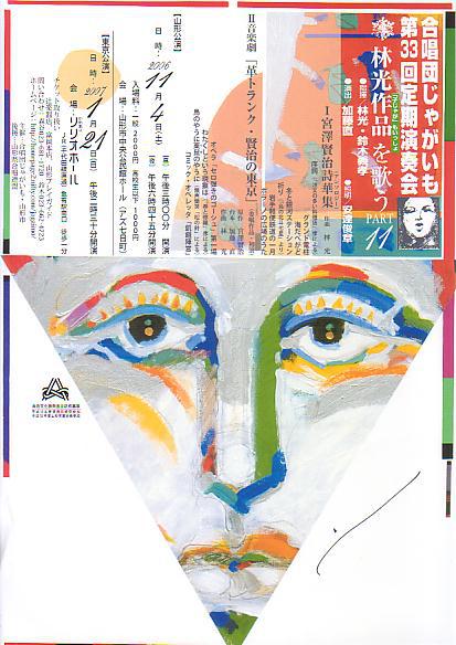山形の「合唱団じゃがいも」は1974年創立。当初はもっぱらルネサンスの合唱曲を歌い、その合間に日本の作品も歌っていた。転機は林光の「原爆小景」に田中信昭指揮で取り組んだ1983年に訪れる。そして3年後に同じ曲を今度は作曲家の指揮で歌って決定的となった。田中指揮で柴田南雄のシアターピースを、林指揮で彼の合唱劇(加藤直演出)をつぎつぎと上演していくうちに、その面白さにすっかりハマり、ついには林光と萩京子に一年交替で(最近は吉川和夫も加えて)合唱劇を委嘱し、初演し続けて、今日に至っている。 私が彼らの演奏会を初めて聴いたのは1988年7月の第15回定演で、林光の「コメディア・インサラータ」と合唱劇「鼠たちの伝説」だった。指揮とピアノは林光。演出は加藤直。何と贅沢なことをやっているんだろう、この人たちは!と驚いたが、ひとりひとりの歌う喜びが生き生きと伝わってくる彼らの声を聴いて、すべて納得。以来、18年。親の練習に付いてきて、見よう見まねで歌っていた“子じゃが”たちも、いまでは頼りになる団員だ。 東京公演の演目は、彼らがここ10年余り委嘱し続け、こだわってきた宮澤賢治が題材である。産地直送、味わい深い山形の「じゃがいも」を賞味するチャンスだ。