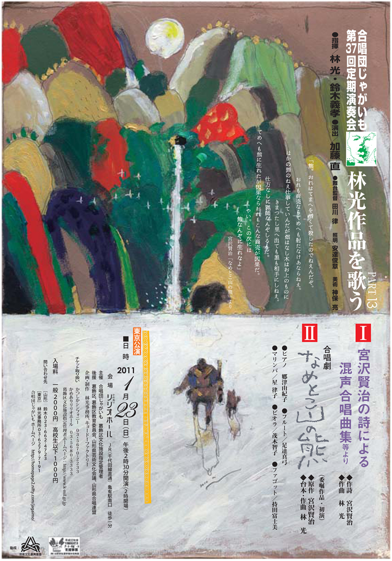 「オペラ セロ弾きのゴーシュ」など、数々の賢治作品をオペラや合唱劇にした林光氏が、合唱団じゃがいものために合唱劇に書き下ろし、賢治作品の合唱劇の集大成として初演します。