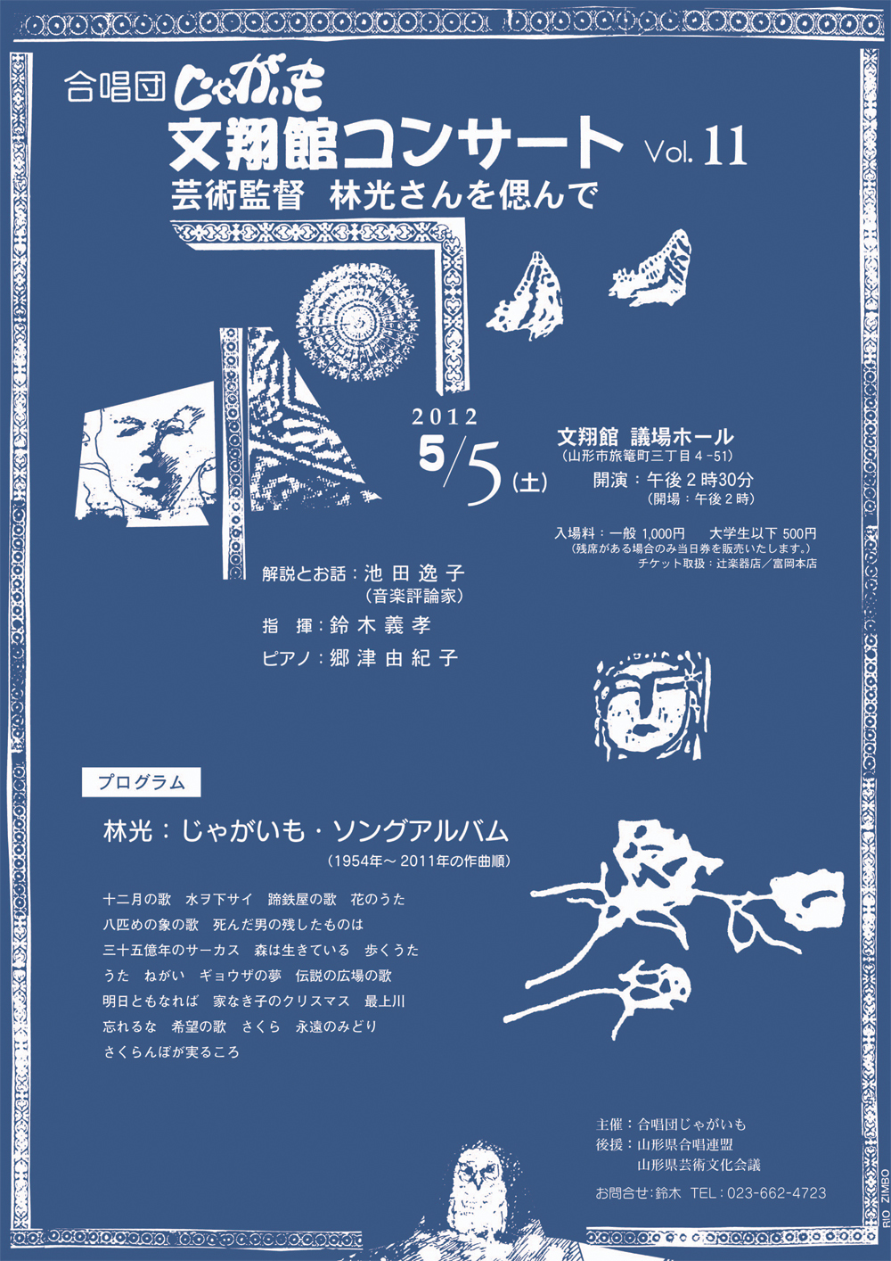 合唱団じゃがいもは、毎年5月に、合唱劇の委嘱初演を中心にした定期演奏会とは違って、いろいろなジャンルの合唱曲を楽しめるコンサートを、山形県の郷土館(旧県庁舎)の議場ホールで開催しています。