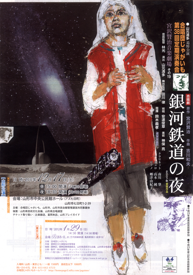 宮沢賢治の「銀河鉄道の夜」は創作家たちに刺激を与え、何らかのかたちで「上演」する欲望をかき立てる作品のようだ。今回ふれることができたのは、山形の「合唱団じゃがいも」による「合唱劇」。原作を忠実にたどりつつ、演戯や視覚的効果を加え、立体的な舞台をつくりだすのだが、中心となるのはあくまで音楽であり、声と声のかさなりによる合唱である。いたずらにひびきを厚くすることのないクラリネットとチェロ、ピアノという3楽器は、人声にたいして陰に陽に派手にならない色をつけてゆく。作曲は宮城教育大学で教授をつとめている吉川和夫。